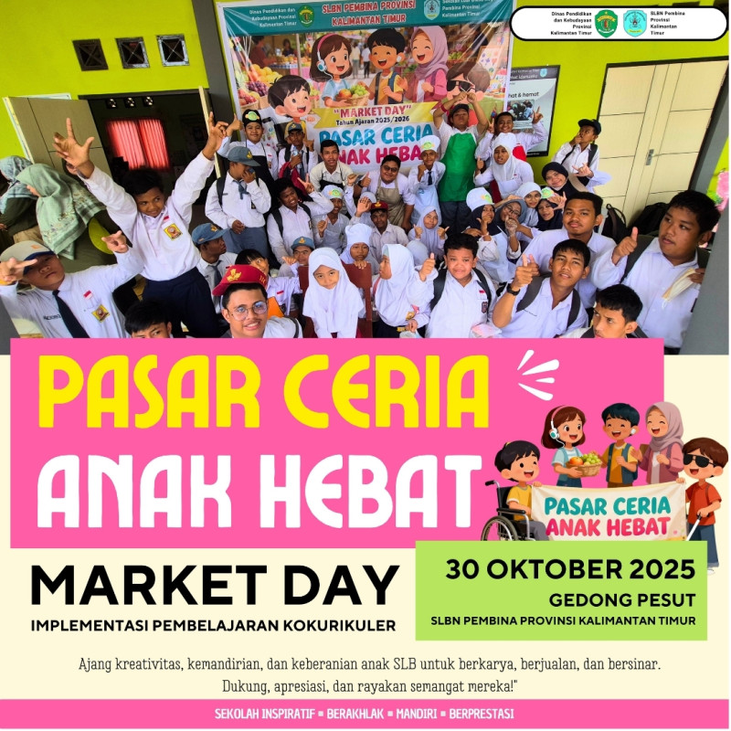 Samarinda, 30 Oktober 2025 — Sekolah Luar Biasa Negeri (SLBN) Pembina Provinsi Kalimantan Timur menyelenggarakan kegiatan Market Day dengan tema “Pasar Ceria Anak Hebat” yang berlangsung di Gedong Pesut SLBN Pembina Provinsi Kalimantan Timur.